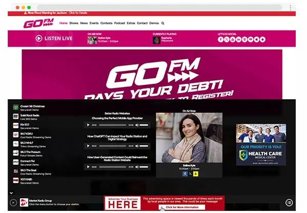 Our advanced multi-station persistent stream player enhances your website’s audio experience, allowing visitors to continuously enjoy radio streams and podcasts without interruption, even as they navigate different pages. The pro version elevates this experience further, offering pre-roll audio and video ads for additional revenue opportunities, extensive customization options, and expanded content access. This feature is designed to keep your audience engaged with your station’s content seamlessly, fostering a more immersive and interactive listening experience.